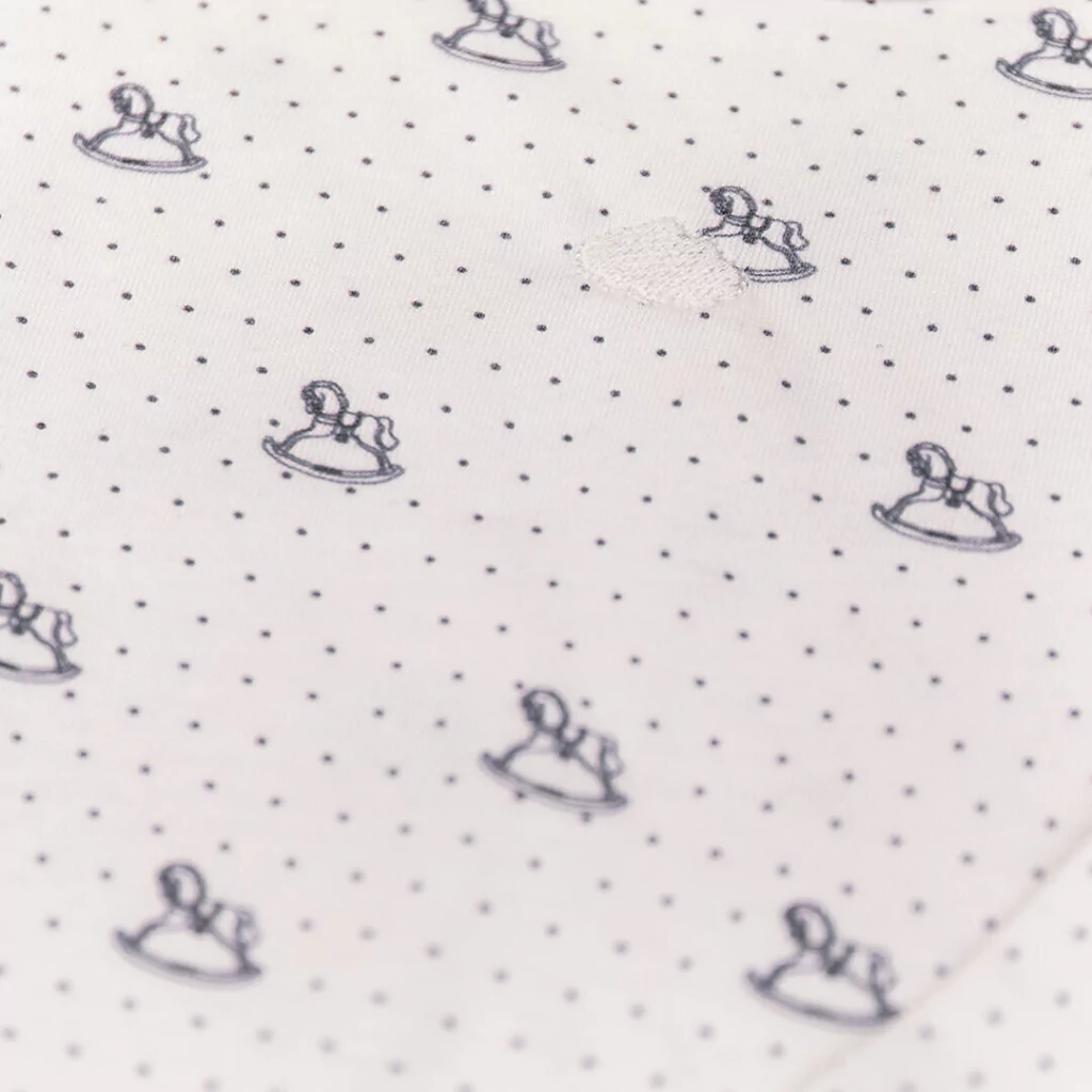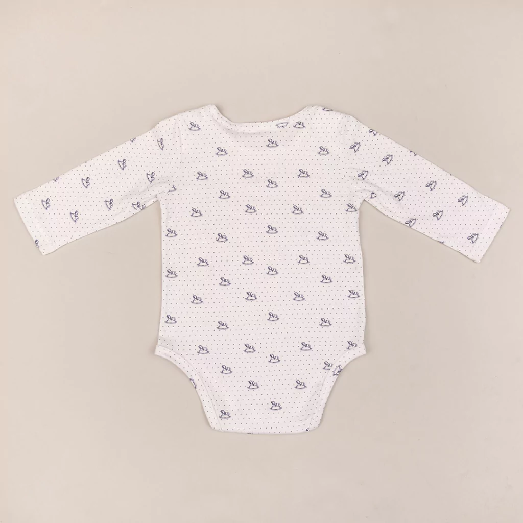 Body estampado en algodón Pima, con cuello americano, mangas largas. Logo bordado y detalle de bordador. Es un tejido dermatológicamente testeado, que atenúa y ayuda a prevenir los riesgos de alergia. Mayor suavidad y durabilidad. Pensado y hecho para la piel del recién nacido, con materiales confortables y suaves.