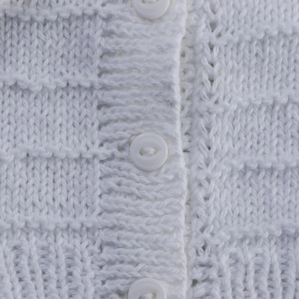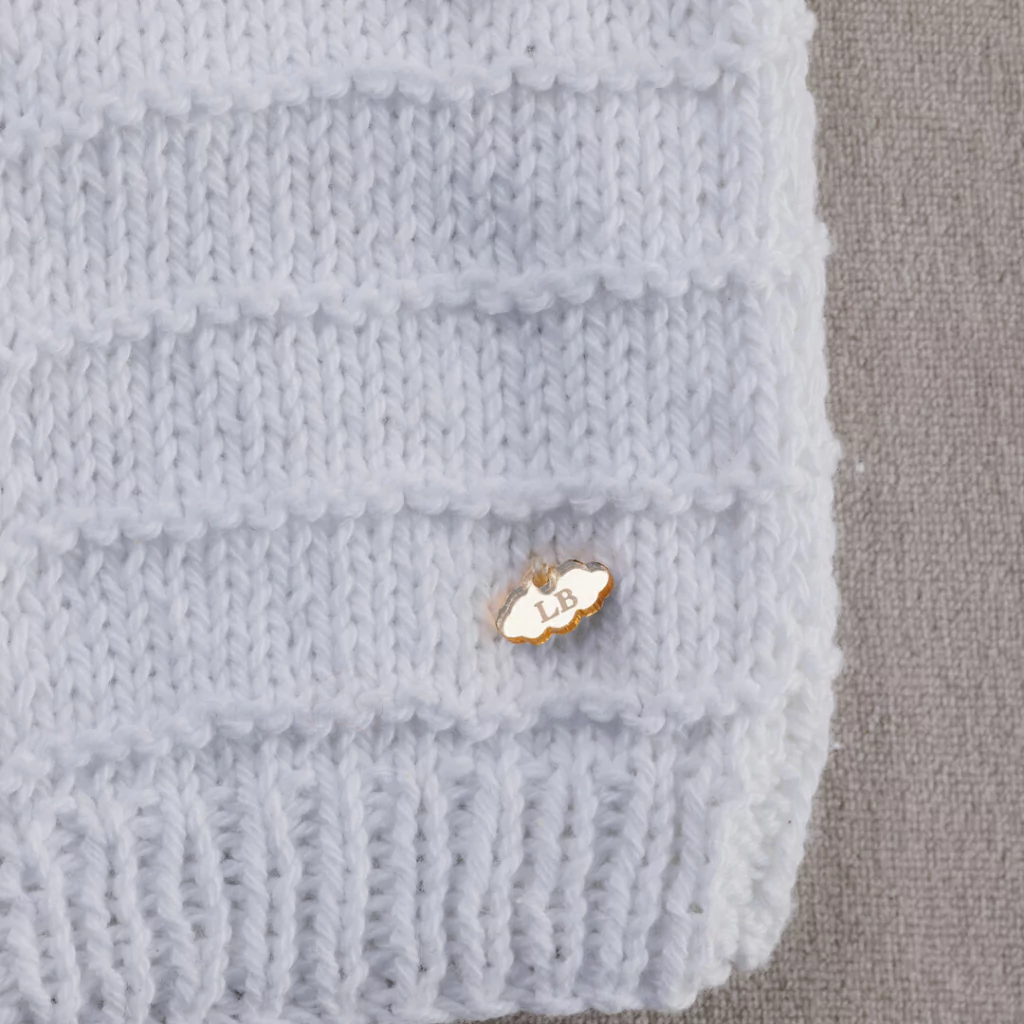 Cardigan tejido rayitas en hilo de algodón, escote redondo. Cartera con botones en frente. Detalle de dije dorado nube. Pensado y hecho para la piel del recién nacido, con materiales confortables y suaves.