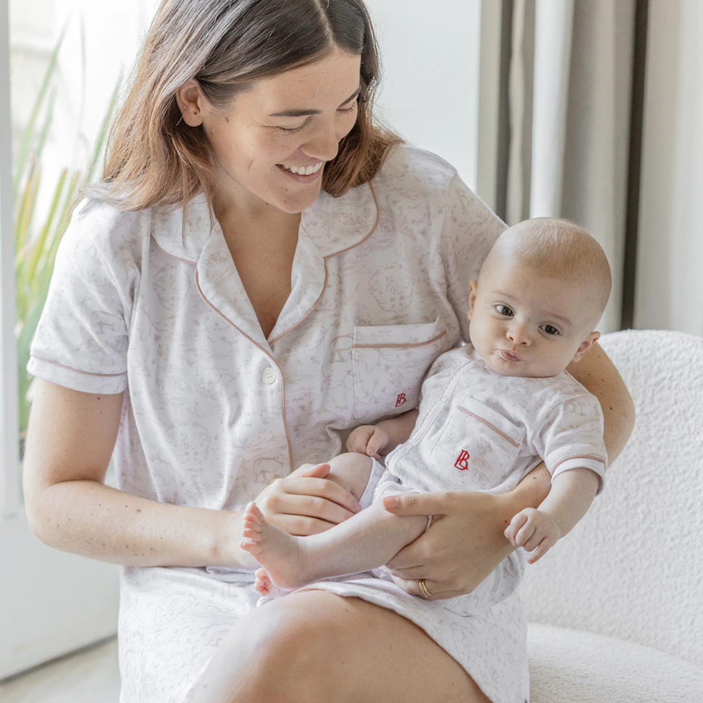 Enterito corto, mangas cortas, estampado en interlock pima. Broches aro libres de plomo, en el frente para acceso de prenda. Detalle de picot y bolsillo en color beige. Bordado en manga. Es un tejido dermatológicamente testeado, que atenúa y ayuda a prevenir los riesgos de alergia. Mayor suavidad y durabilidad, hipoalargénico. Pensado y hecho para la piel del recién nacido, con materiales confortables y suaves
