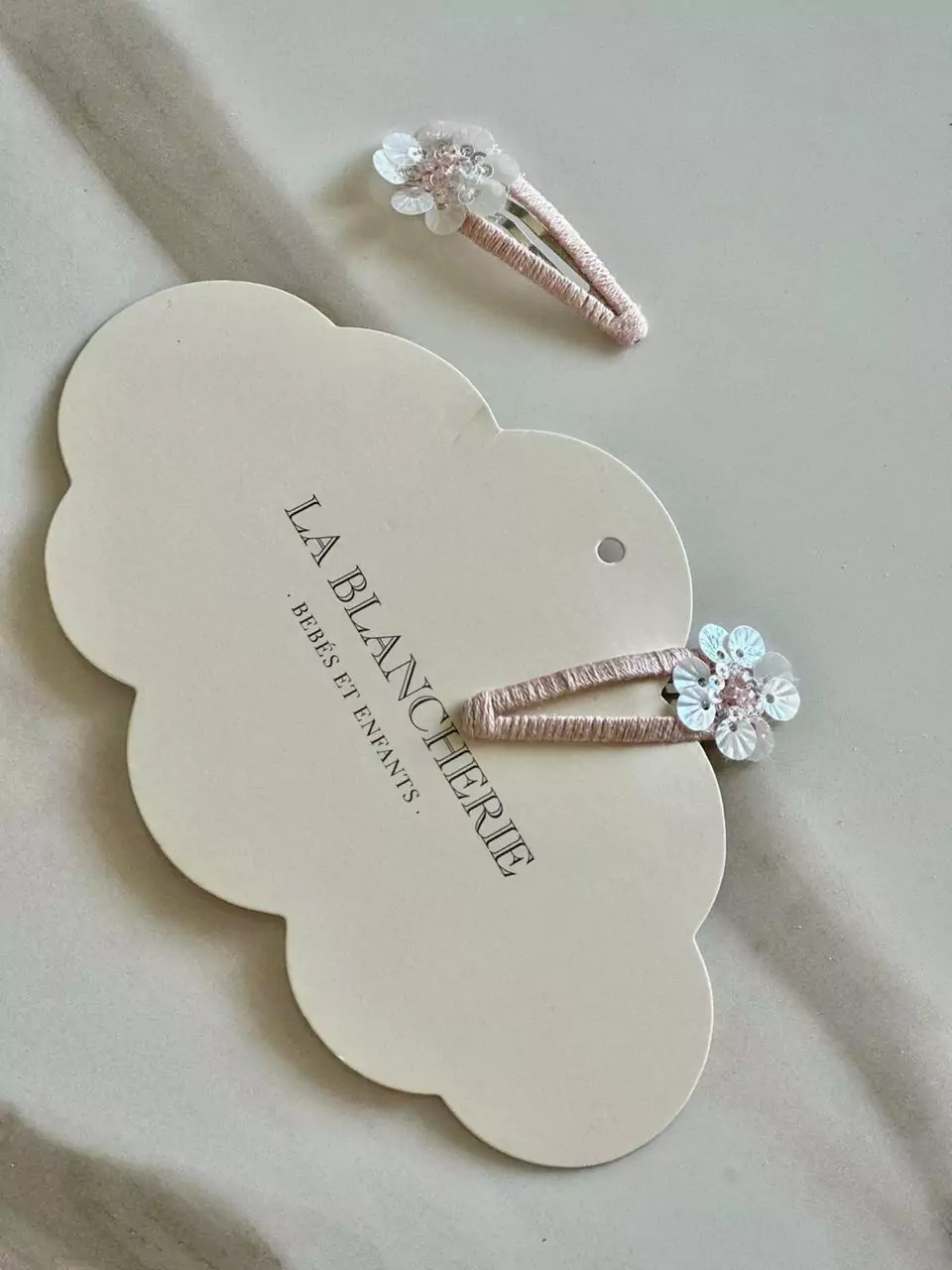 Pack de dos hebillas tic tac metalicas forradas en hilo color rosa. Detalle de Flor con canutillos. Ideal para sumar a los looks de celebración