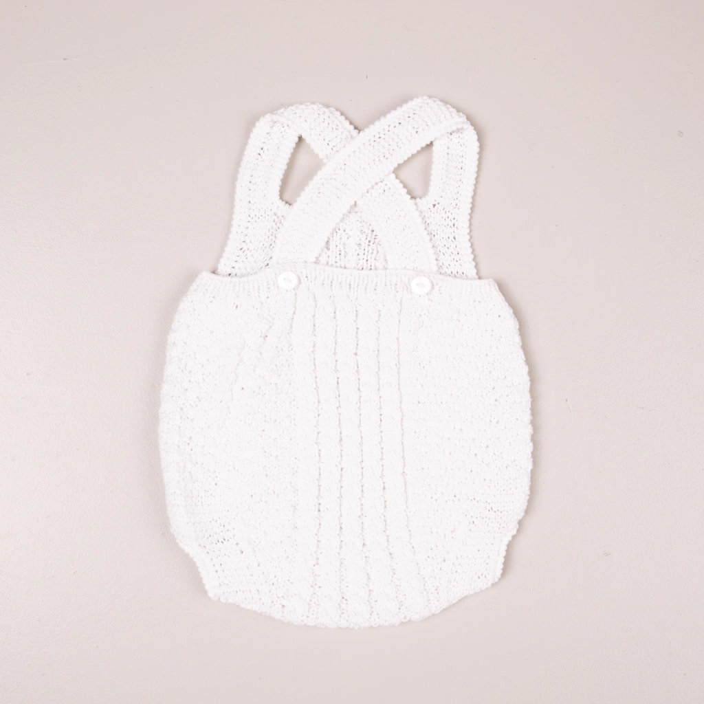 Jardinero tejido en hilo de algodón, con breteles y apertura en frente con botones. Unisex. Detalle de dije dorado en frente. Pensado y hecho para la piel del recién nacido, con materiales confortables y suaves.