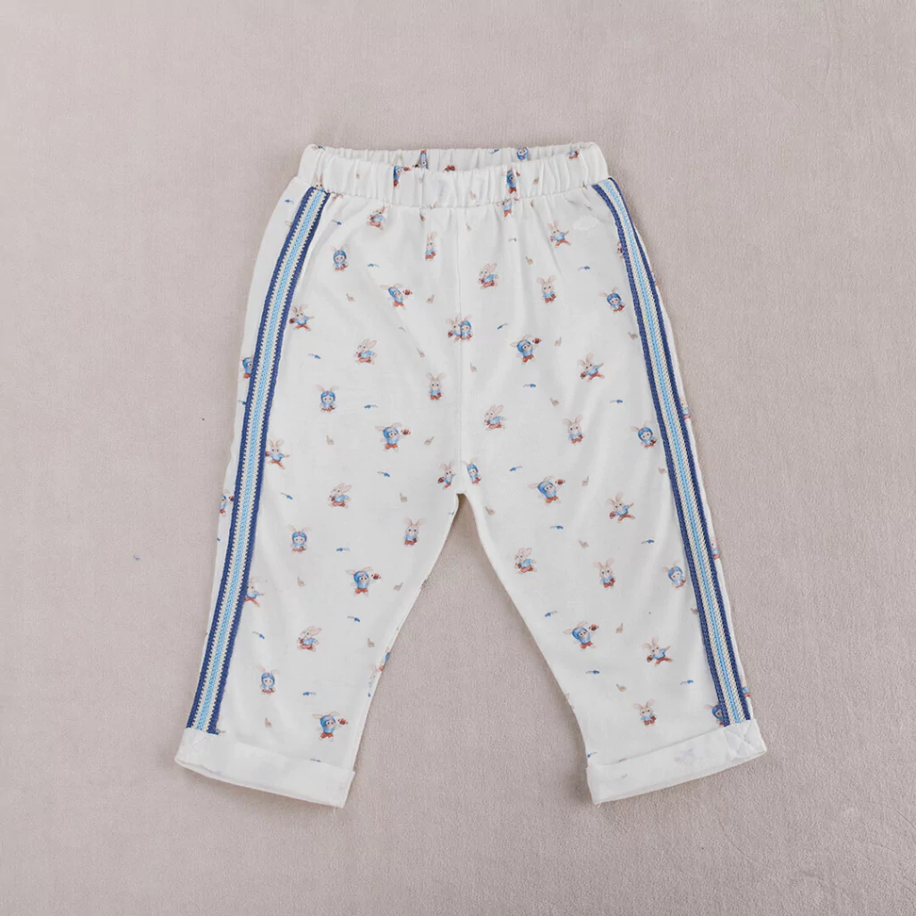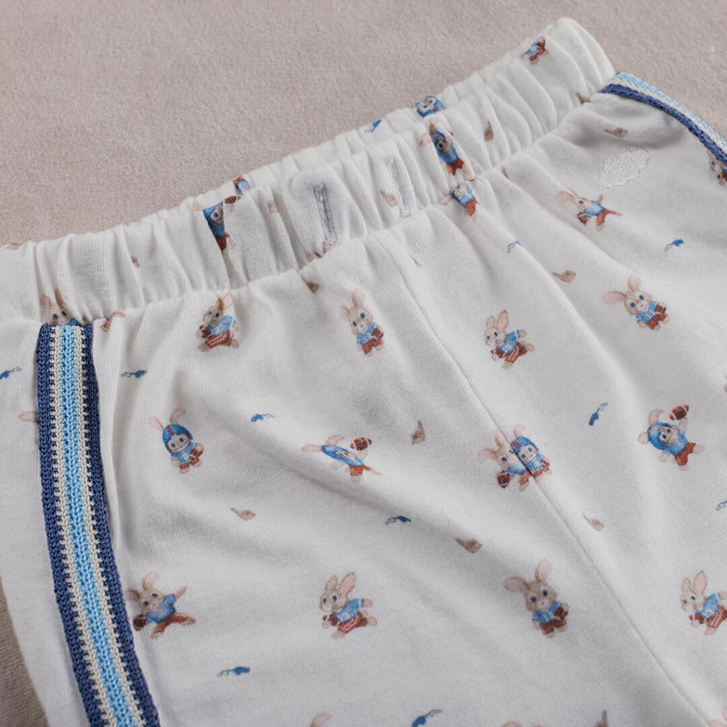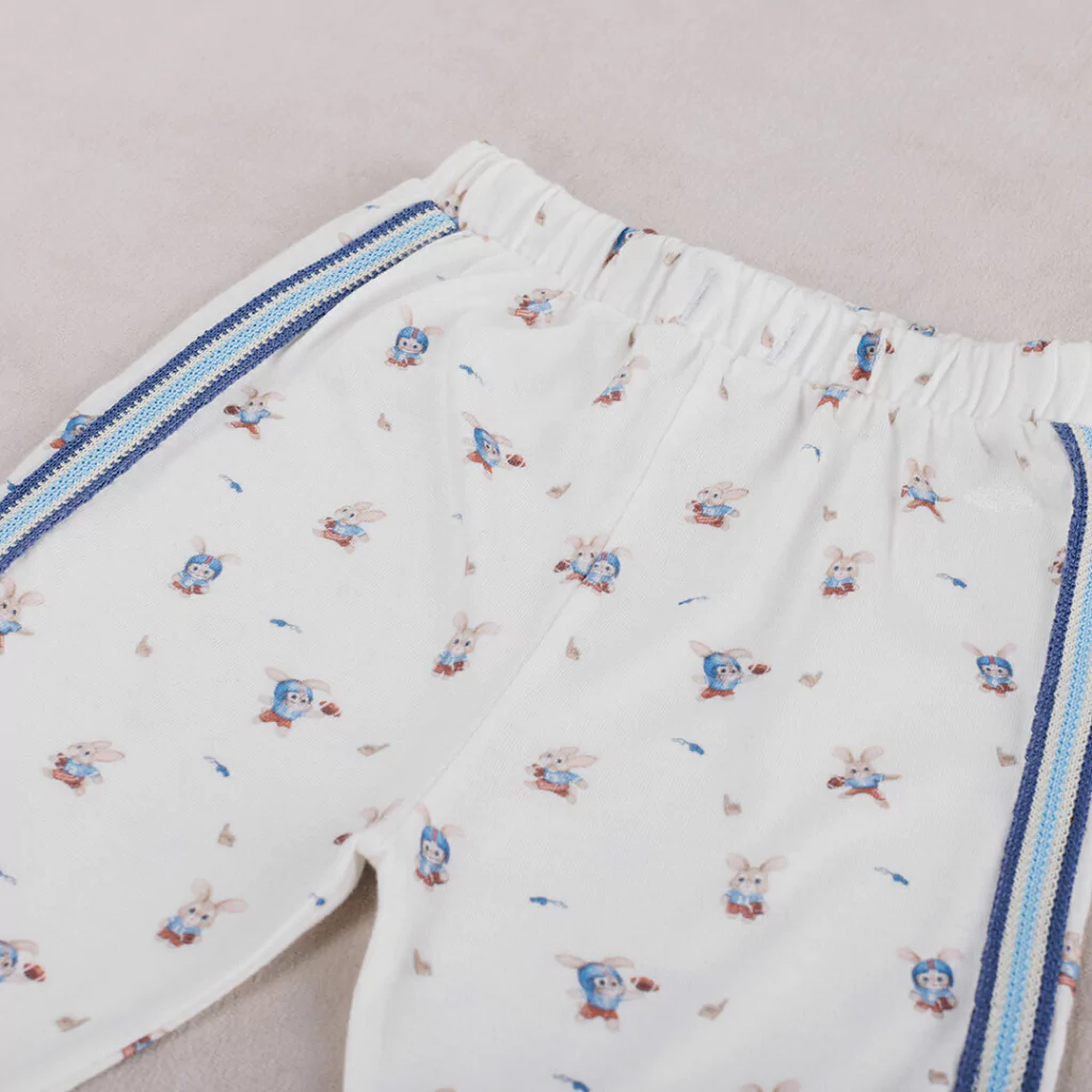 Pantalón de algodón estampado. Cintura con elástico interior.Piernas con detalle de cinta tejida en los laterales. Logo bordado. Pensado y hecho para la piel del recién nacido, con materiales confortables y suaves.