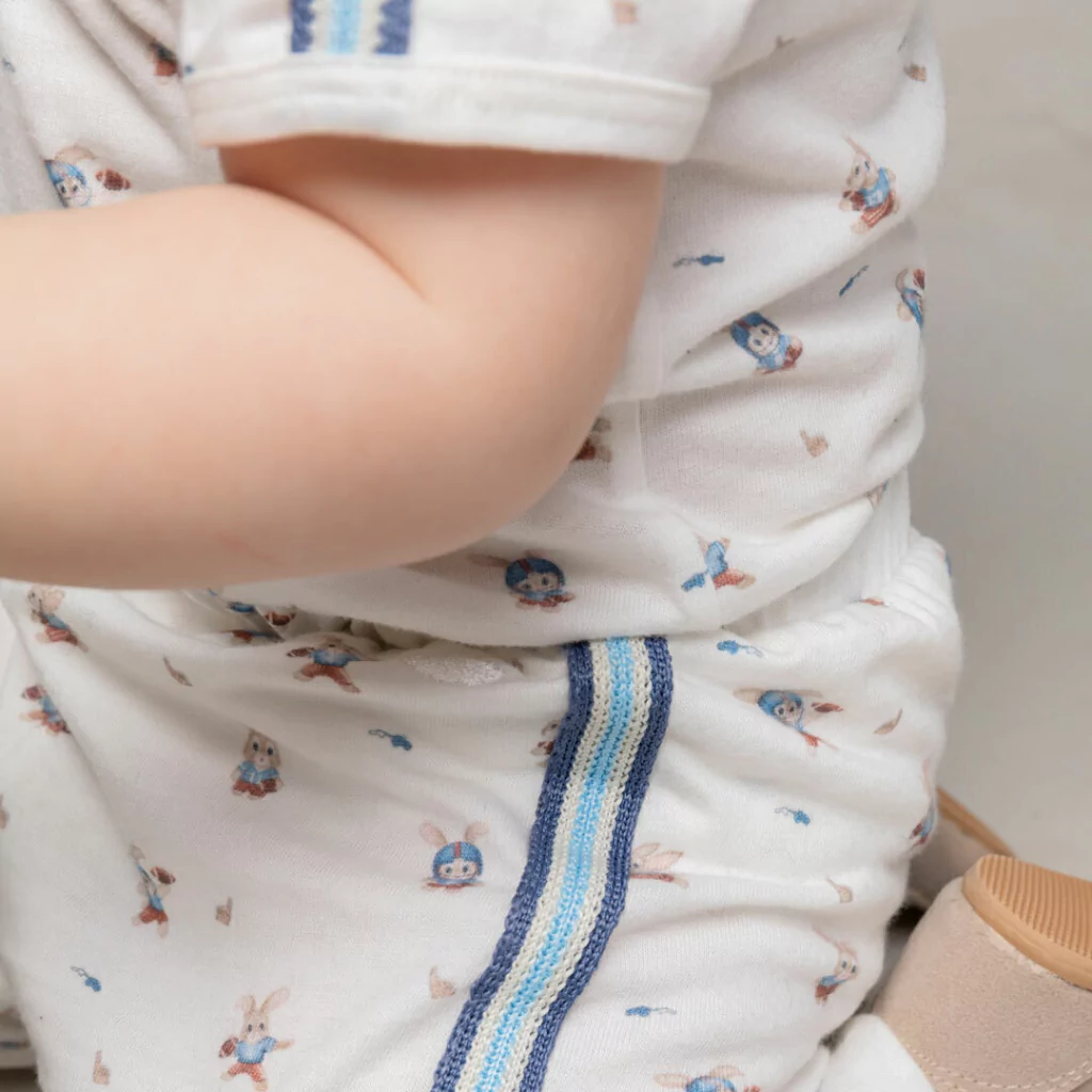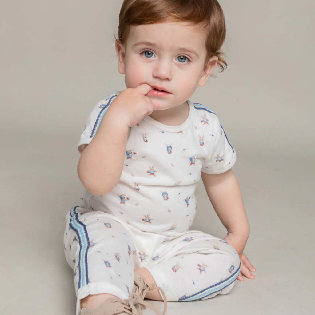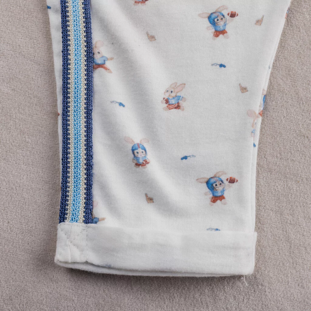 Pantalón de algodón estampado. Cintura con elástico interior.Piernas con detalle de cinta tejida en los laterales. Logo bordado. Pensado y hecho para la piel del recién nacido, con materiales confortables y suaves.