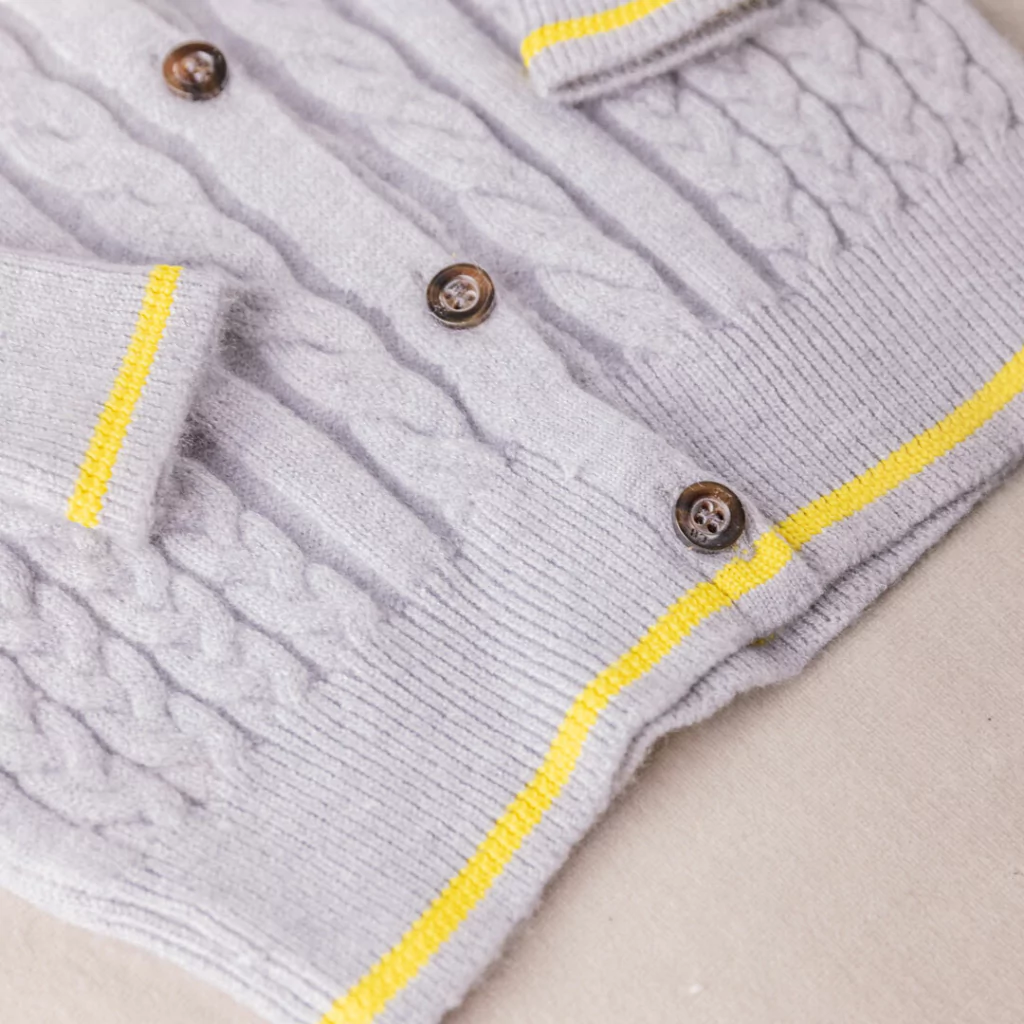 Cardigan tejido con punto trenzas, con cuello, puños y cintura con vivo a contratono. Botones en frente para su apertura y dije dorado. Pensado y hecho para la piel del recién nacido, con materiales confortables y suaves
