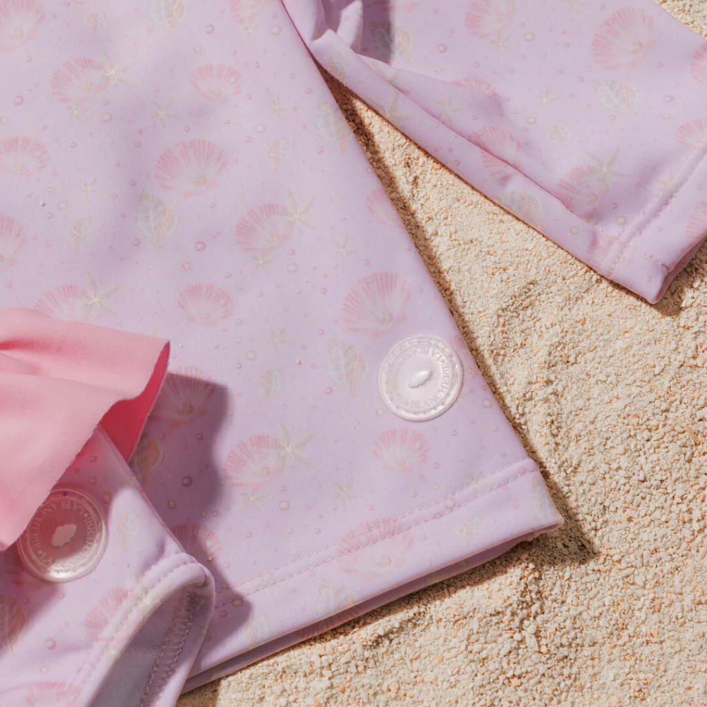 Remera estampada con protección UV, escote redondo. Detalle de voladitos en las mangas. Espalda con cierre. Parche plastisol en el frente.