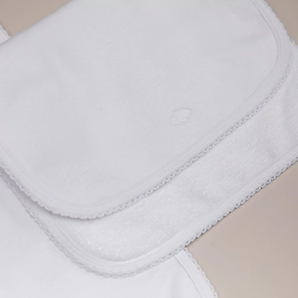 Set de 2 babitas. Ambas blancas lisas con logos bordados. Están hechas de interlock pima en el frente y en el dorso tienen microfibra. Ambas tienen detalle de picot en todo el contorno. Es un tejido dermatológicamente testeado, que atenúa y ayuda a prevenir los riesgos de alergia. Mayor suavidad y durabilidad, hipoalargénico. Pensado y hecho para la piel del recién nacido, con materiales confortables y suaves