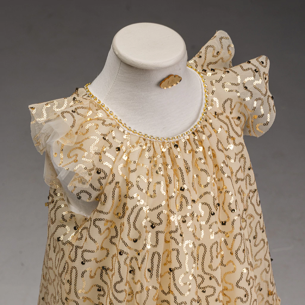 Vestido de tul bordado con lentejuelas, forrado en varias capas de tul liso y voile de algodón. Detalle de strass en contorno de escote y dije dorado. Al ser un vestido de alta costura, los insumos como botones, piedritas, cierres, pueden variar.